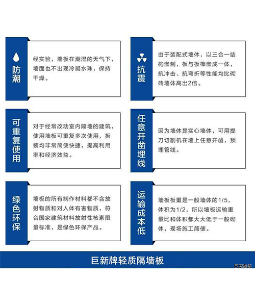 巨新輕質(zhì)墻板由硅酸鈣板、水泥、聚苯顆粒、多種輕集料組成所以保溫。